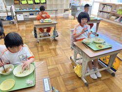 ≪1年生≫初めての給食・・・おかかあえは少し減らしてもらっていましたが、後はほとんど分けたもらっただけ全員時間内に食べきることができました。