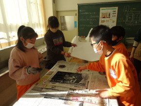 4人グループになり、仲良く共同作業で、版画を刷っていました。手が真っ黒になるとせっかく刷り上がった紙の白い部分が汚れてしまします。でも、ちゃんと4年生が優しくお世話していました。とっても微笑ましくて、上手に作業をしていました。