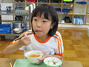 「What vegetable do you like?」を使って、答えるトレーニングと二人で質問し合うトレーニングをしていました。意外にすんなり答えられる野菜。さすが平泉寺の子だなあ…。「I like sweet potato.」「I like tomato.」 「I like potatoes and corn.」 など、上手に答えていました。