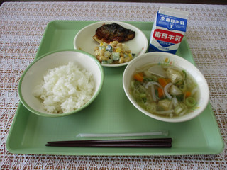 今日のメニュー:ごはん、牛乳、けんちん汁、鯖の竜田揚げ、大豆サラダ
